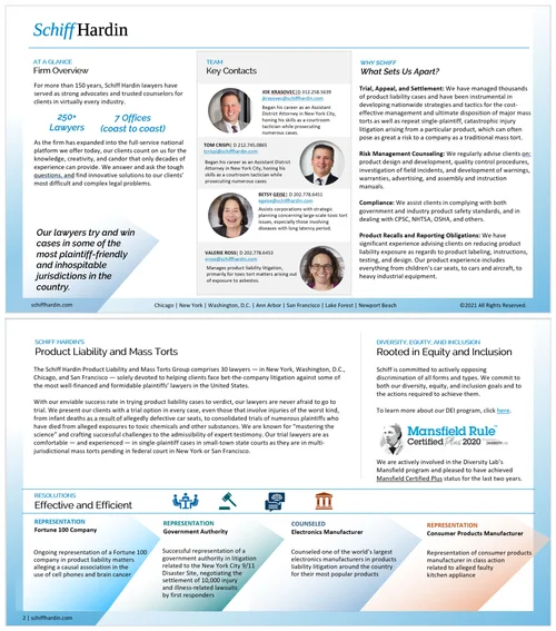 So, to achieve all of this, we quietly began to refresh our brand. We started by evolving the firm’s visual identity (colors, fonts, graphics, and images) and turning black and white photos to color – bringing the firm and our people to life. We first applied these brand changes to our internal communications and slowly started updating our external marketing platforms across print, digital, and mobile, so that no matter where a client is located or how they are reaching us, they will have a consistent and dynamic experience with Schiff.